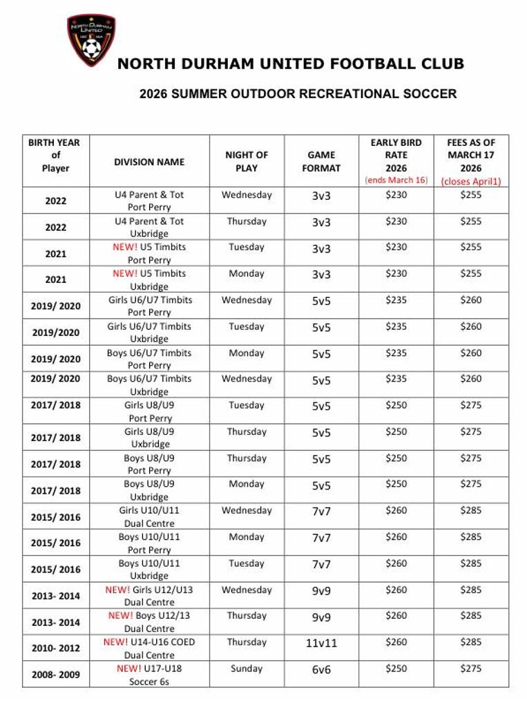 Welcome to the Registration page for all North Durham United Football Club soccer programs.